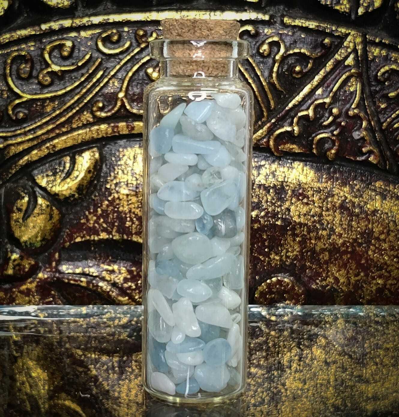 Lasipullo, jonka sisällä on akvamariinia