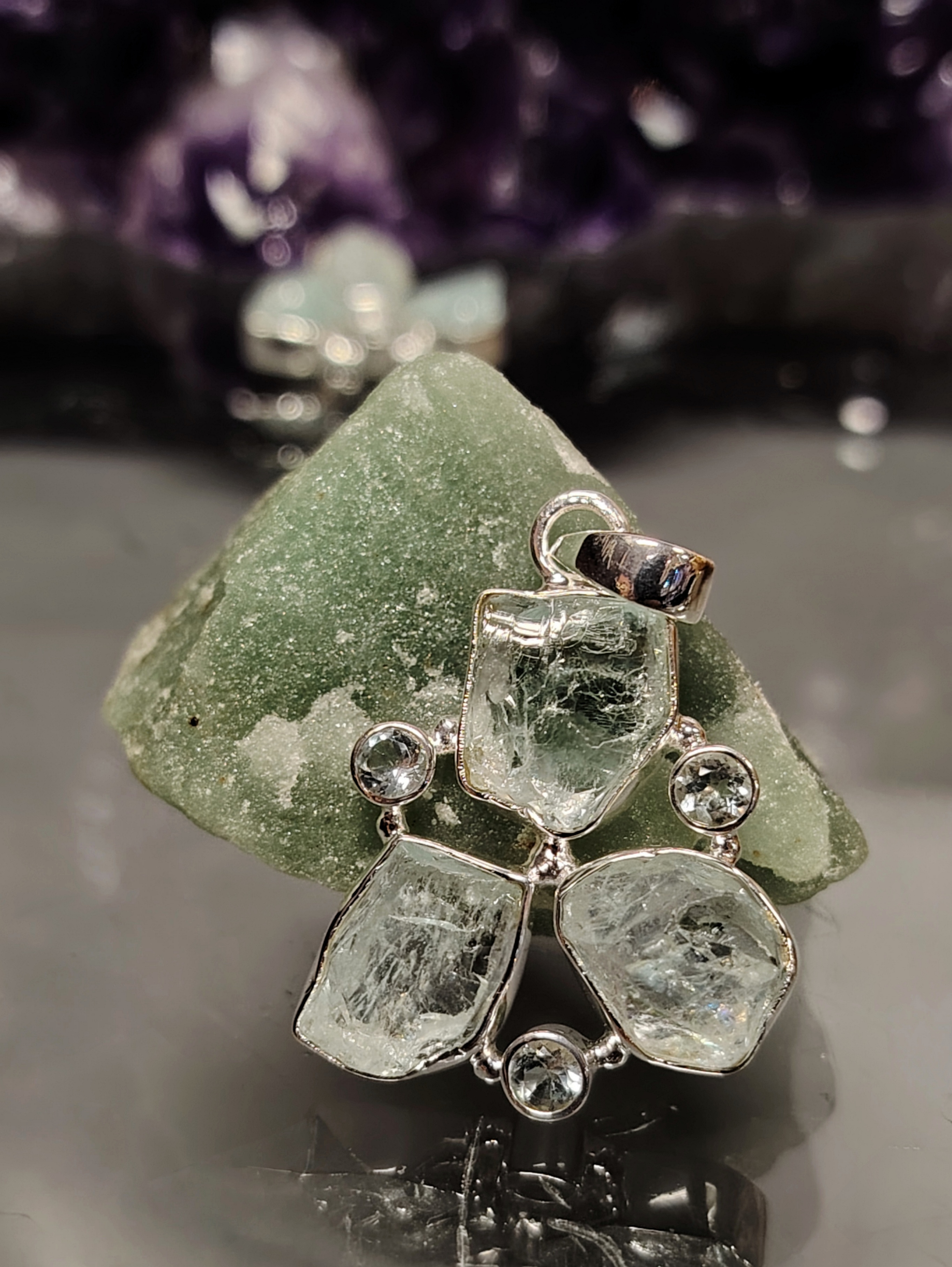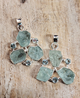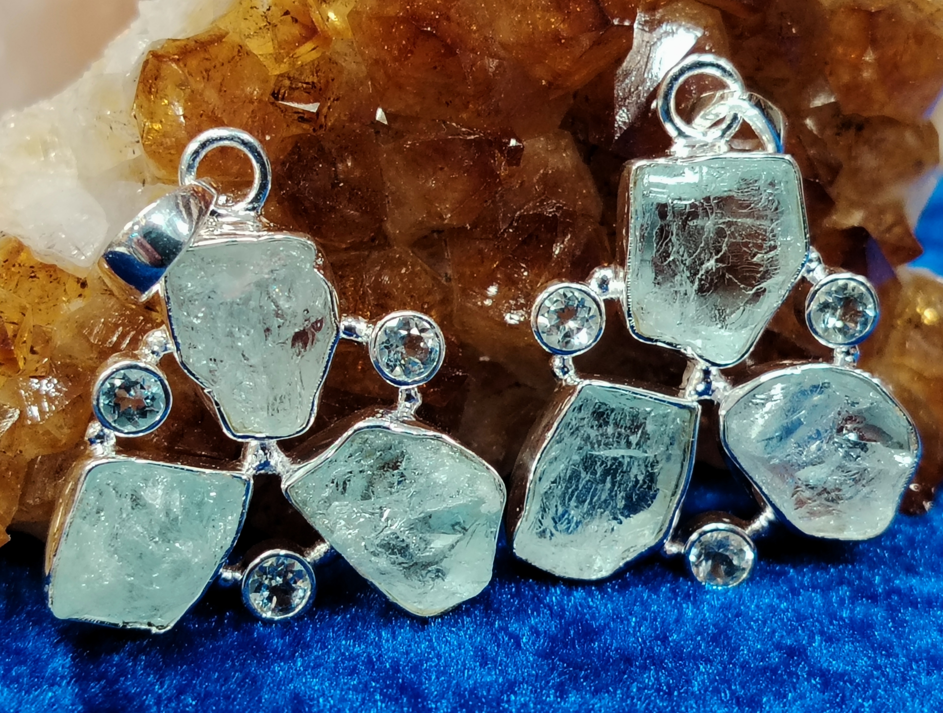 Erittäin upea rouheasta akvamariinista ja viistehiotuista topaaseista valmistettu riipus hopeisin metalliosin