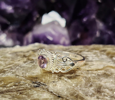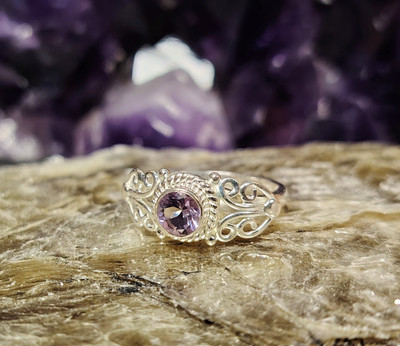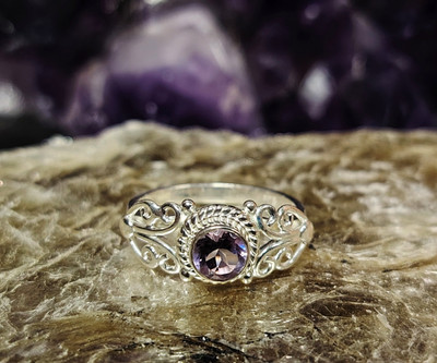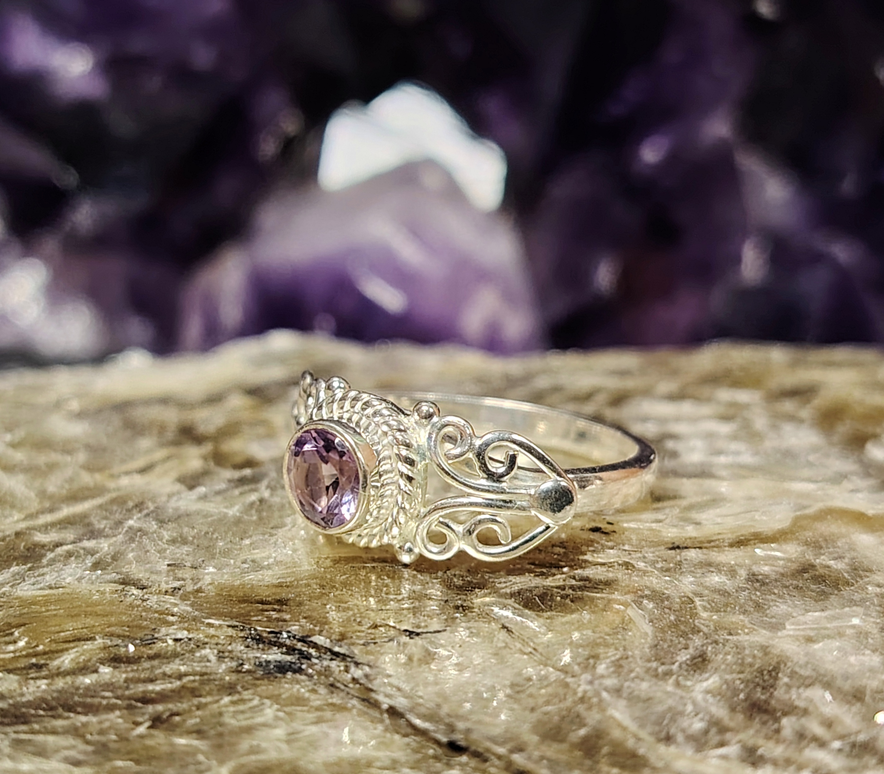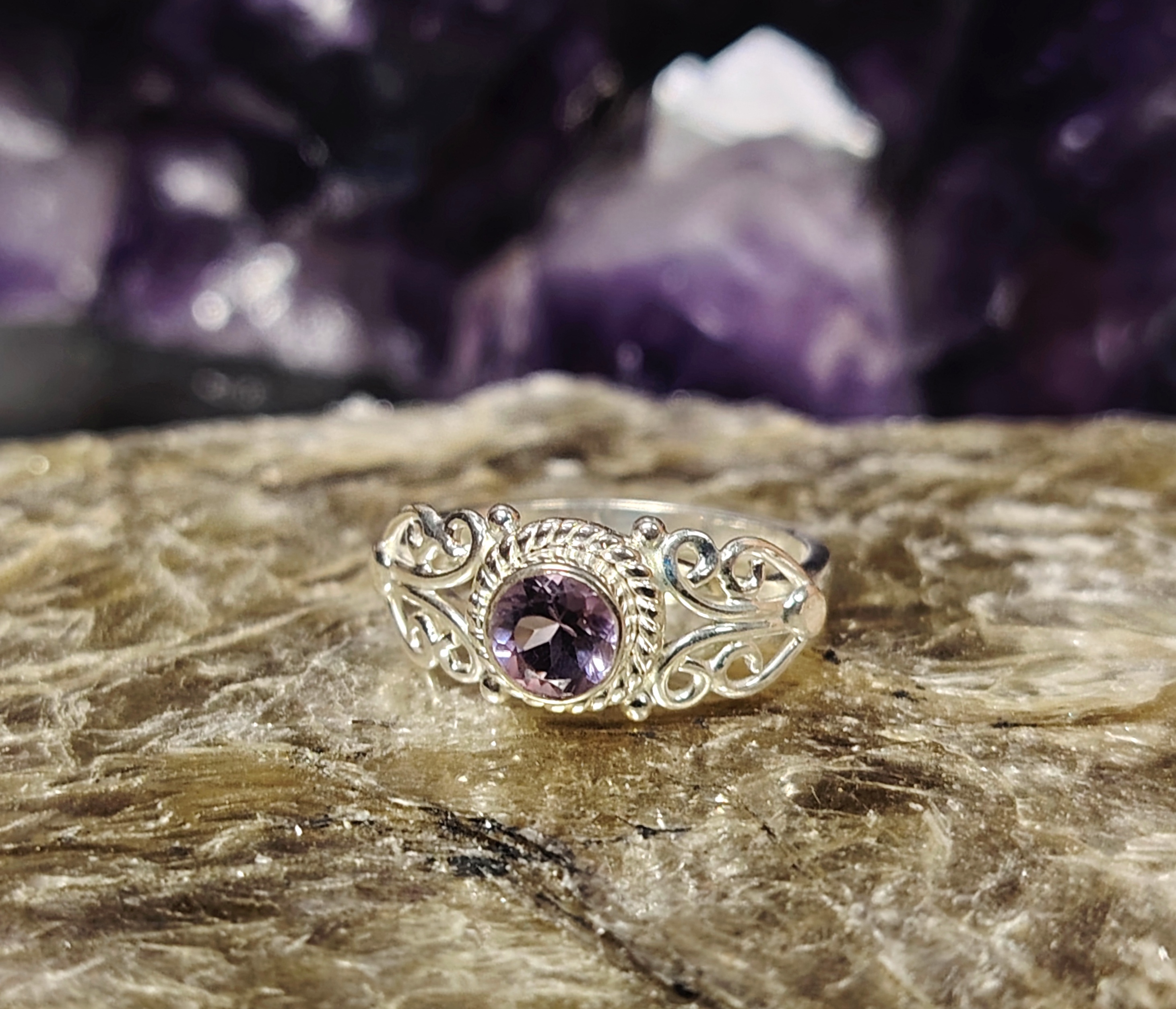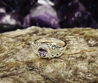Upea hopea sormus, jossa kivenä pyöreä viistehiottu ametisti