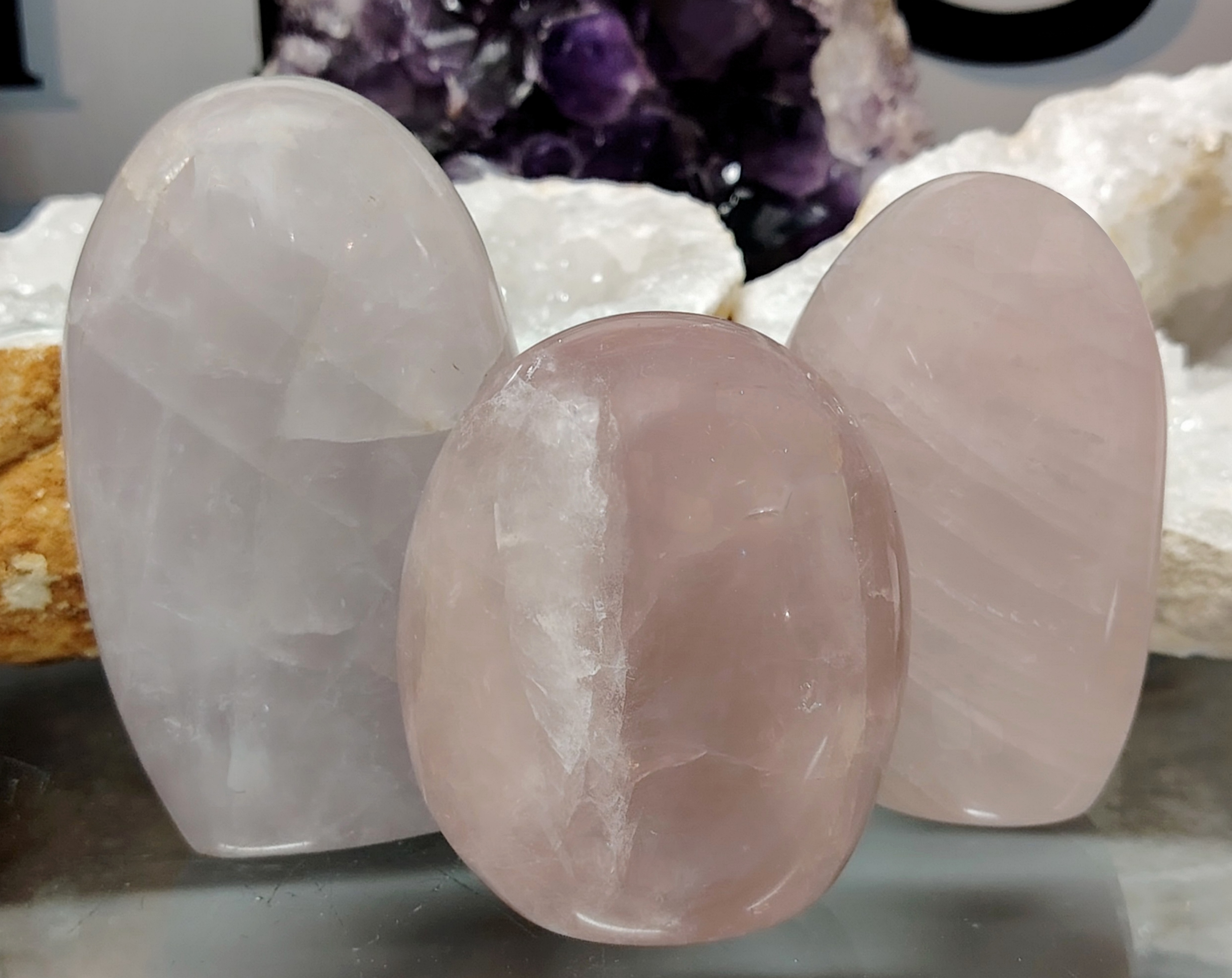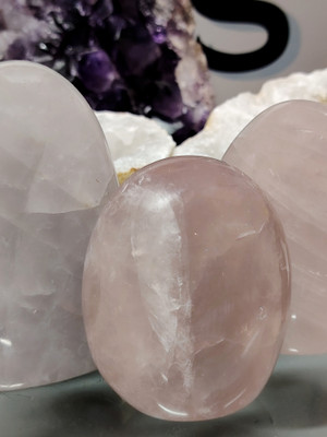 Vapaamuotoisesti hiotun laventeliruusukvartsi paasin korkeus on noin 85- 120 mm.
