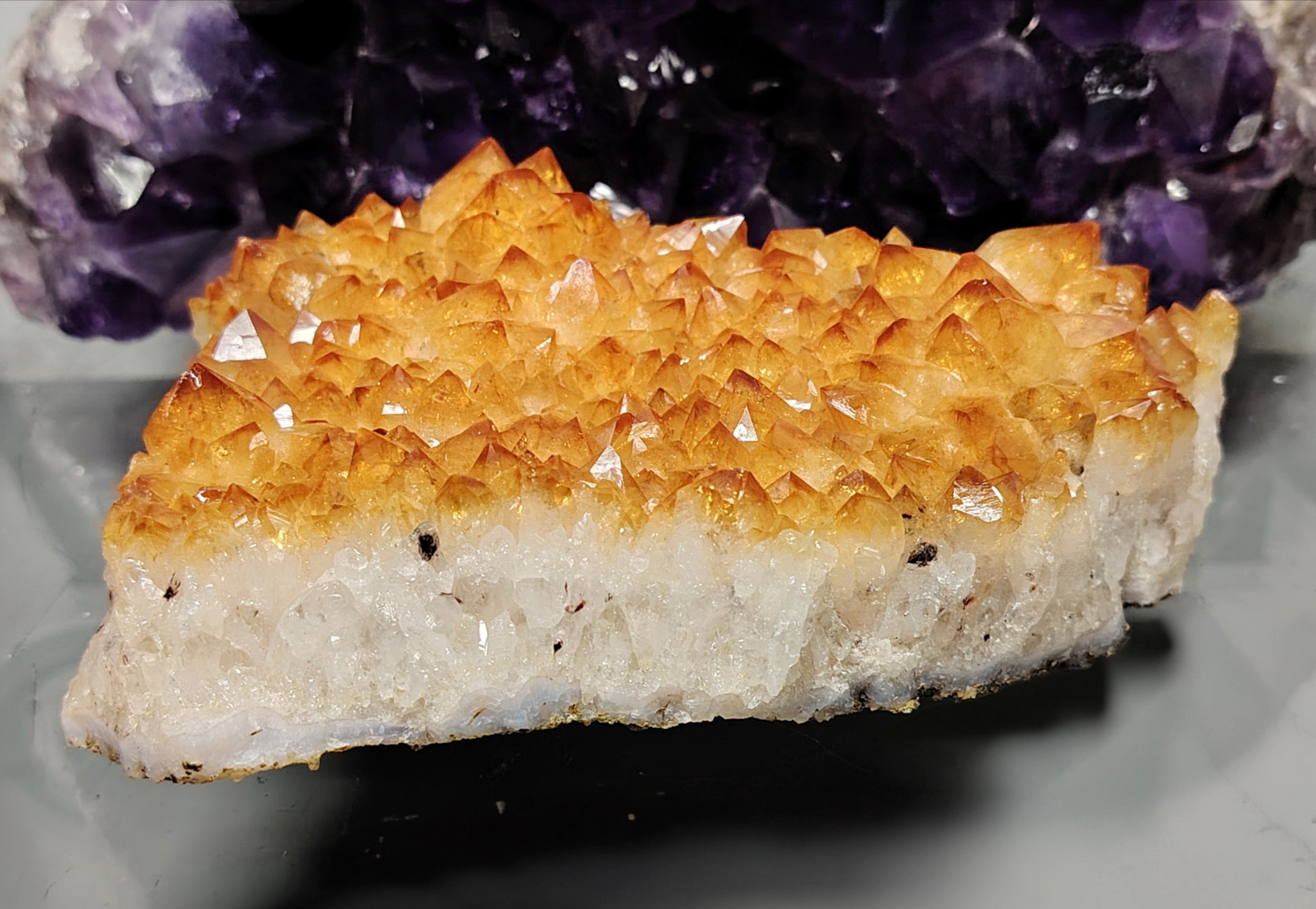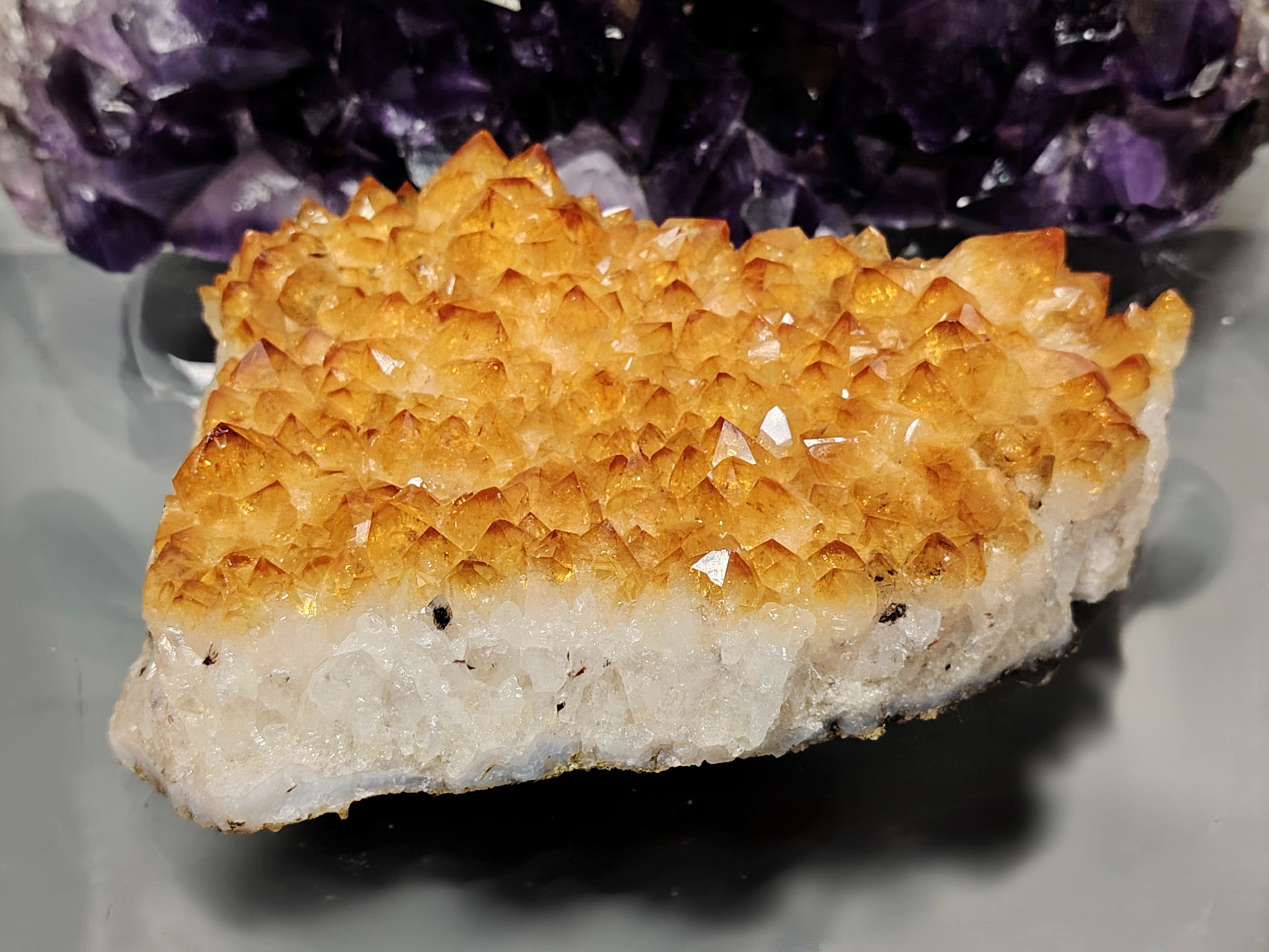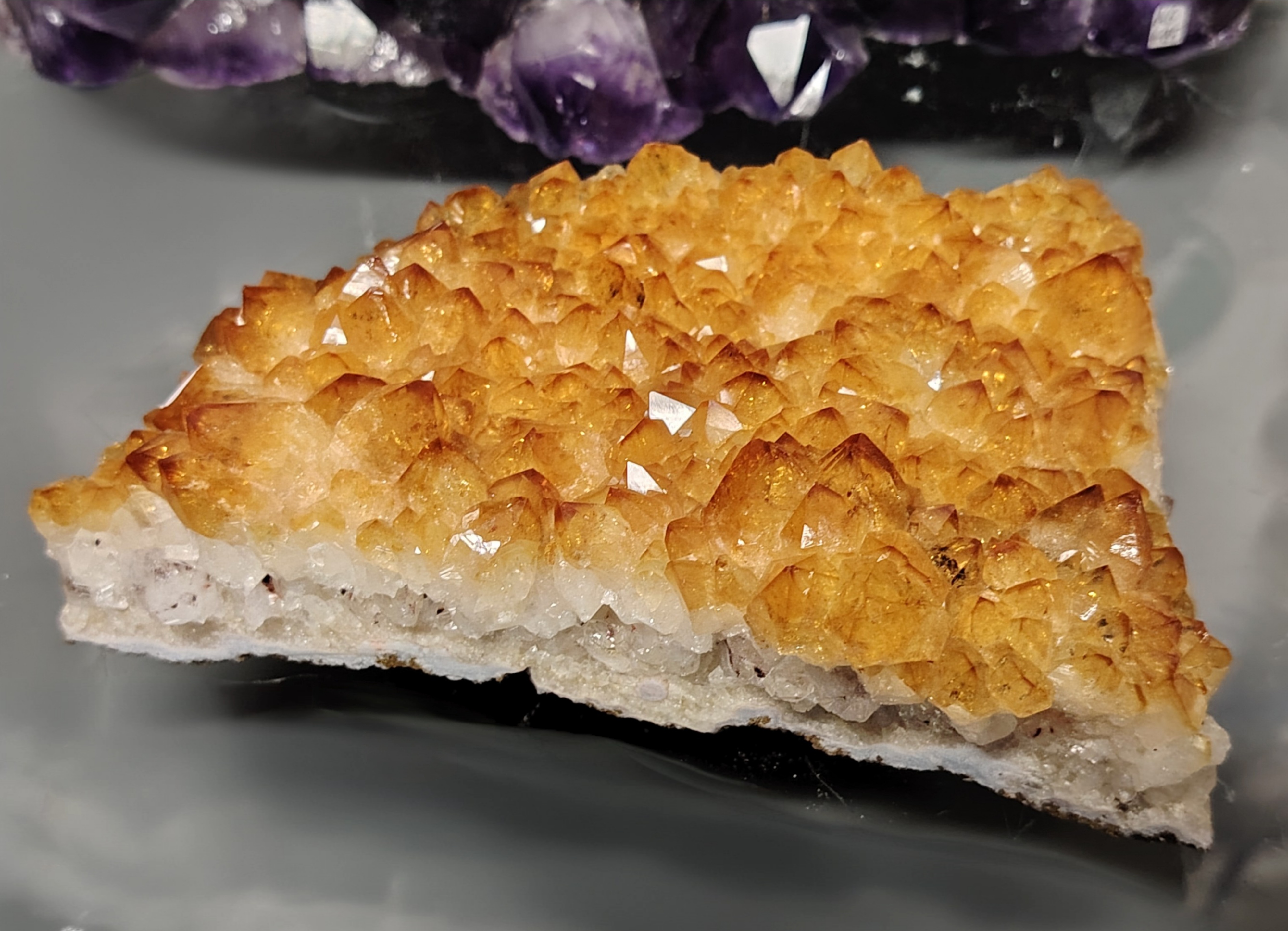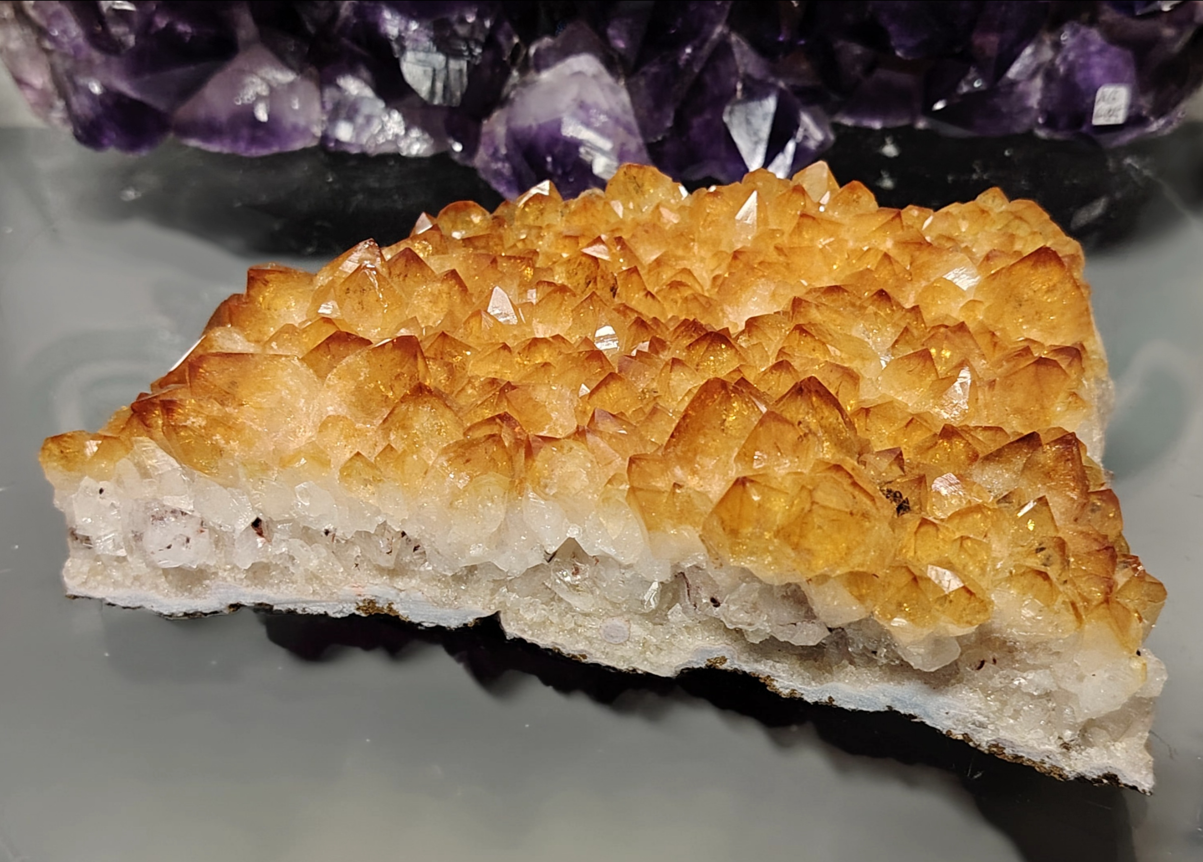 Tämän kuvanmukaisen sitriini yksilön mitat ovat 160/115/40 mm, paino 1033 gr.