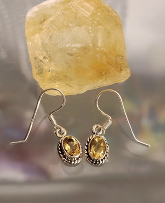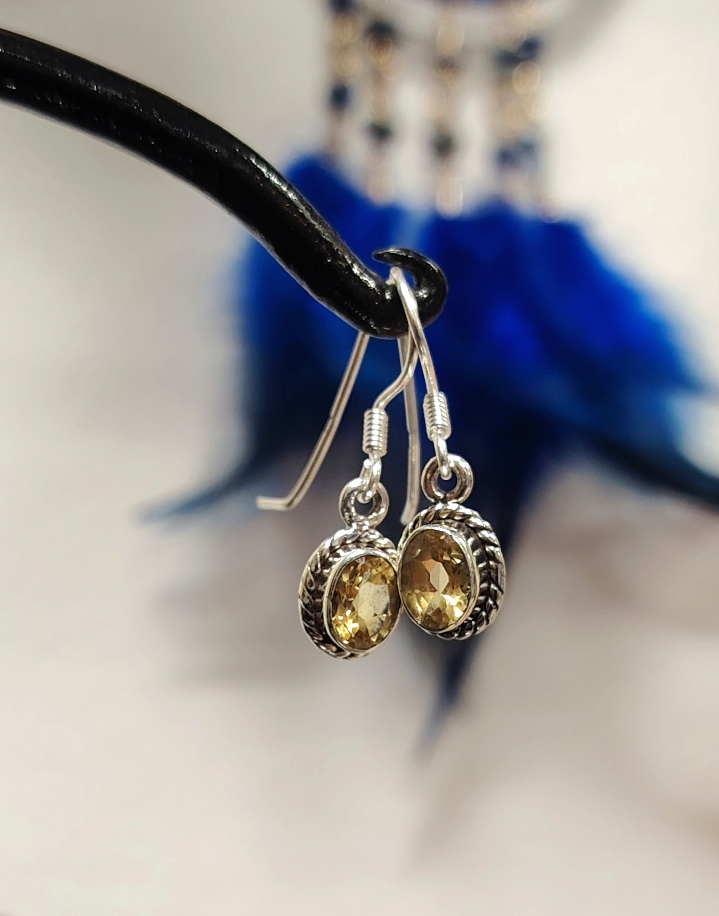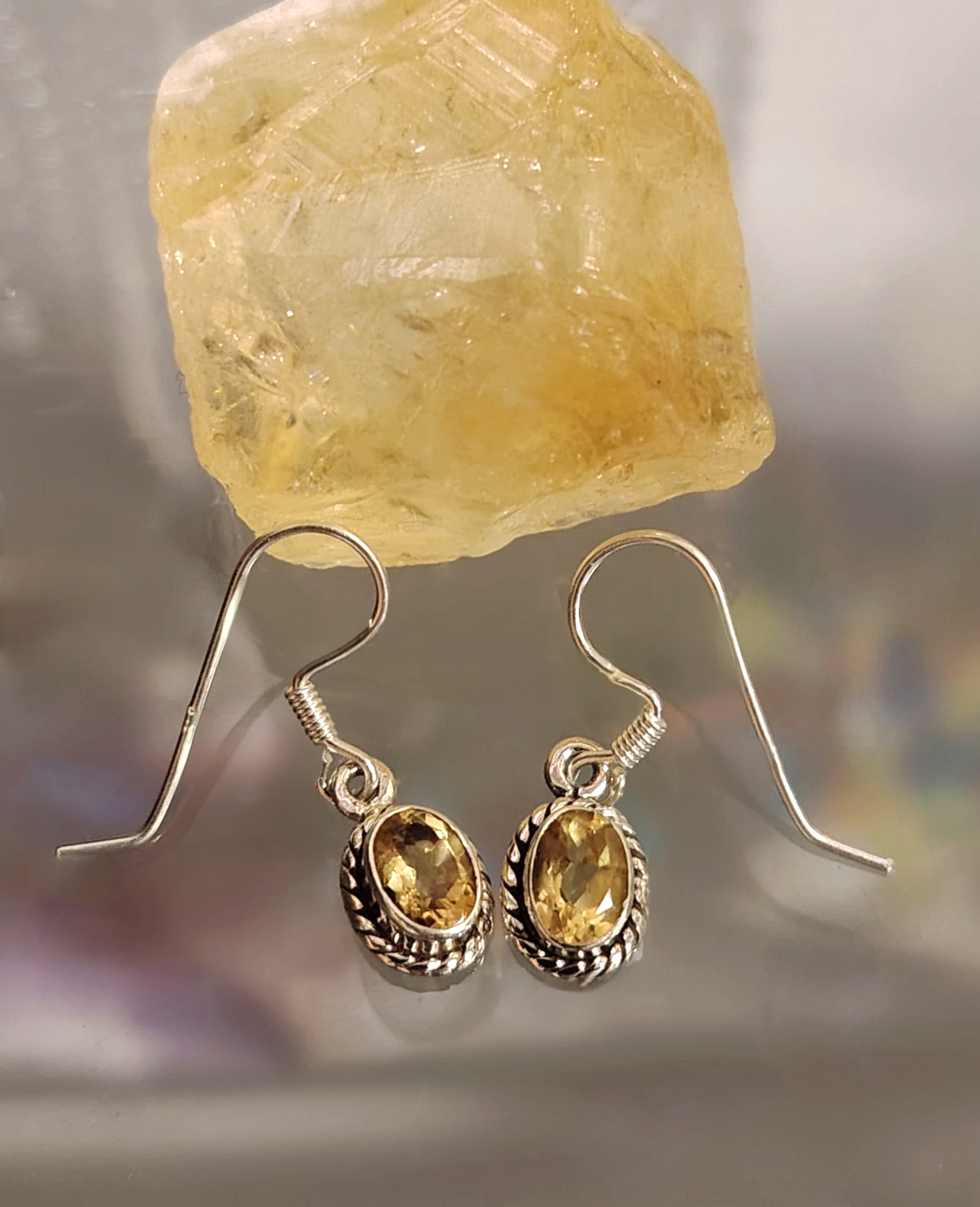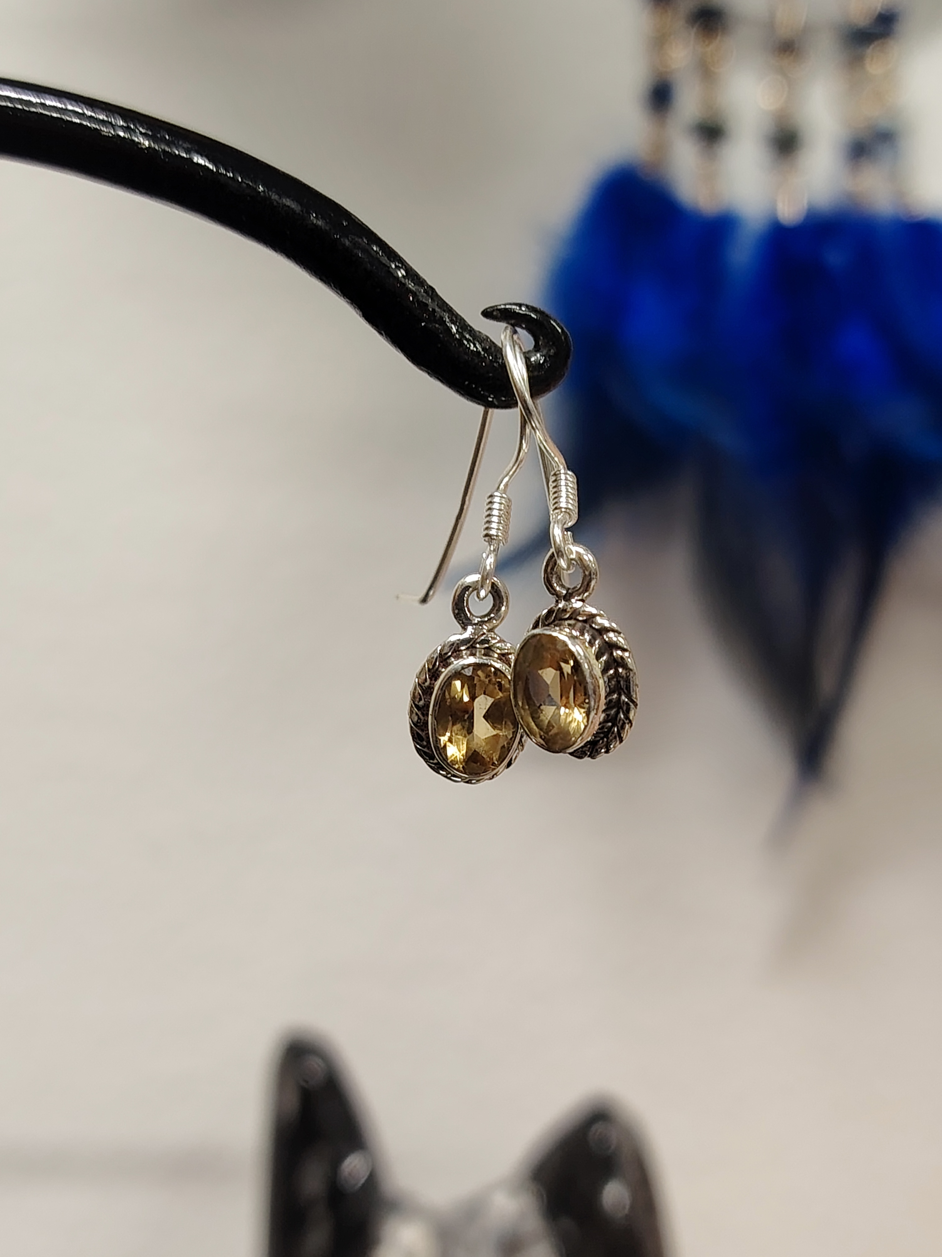 Upeat korvakorut viistehiotuilla sitriini kivillä ja hopeisilla metalliosilla