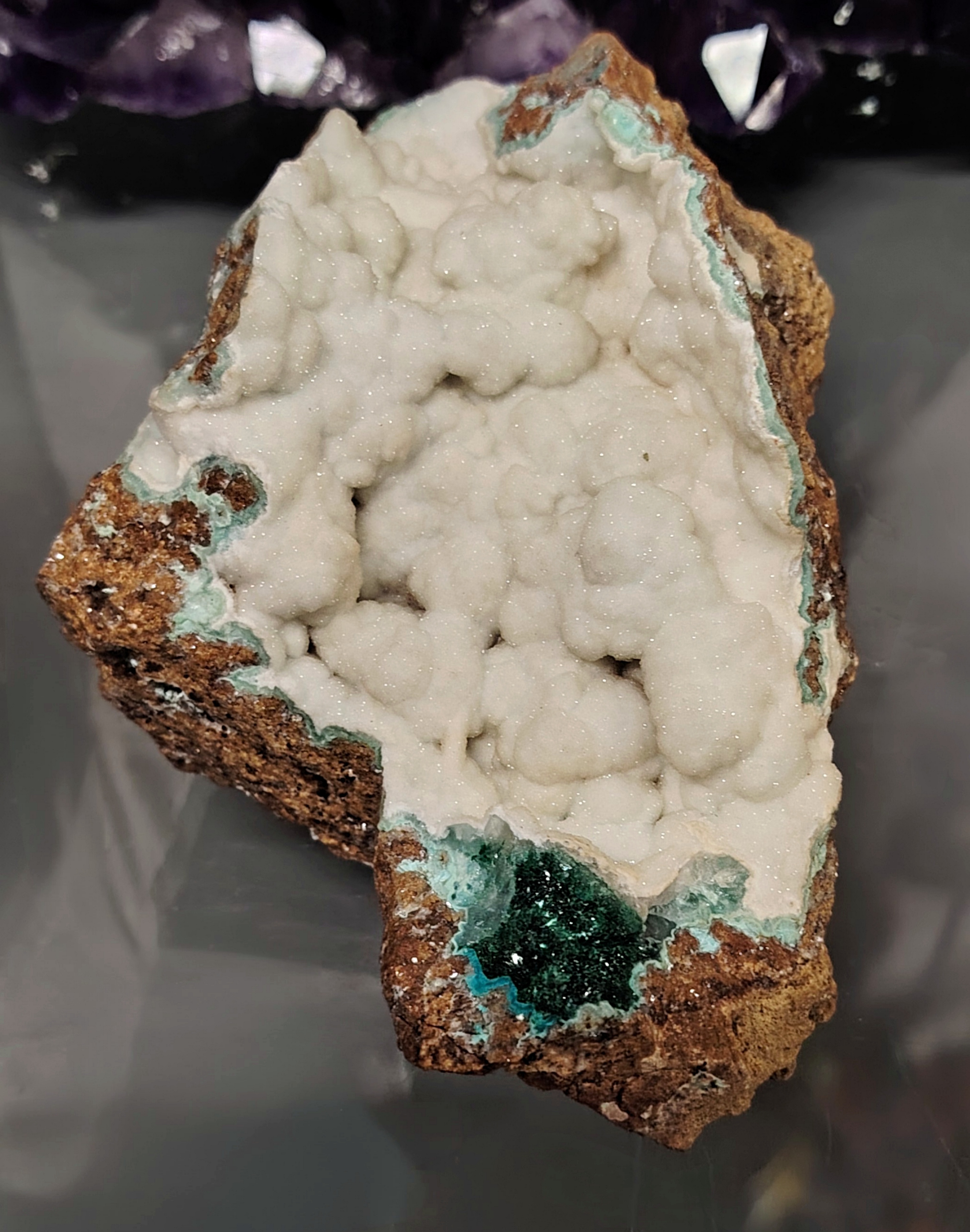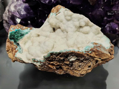 Upeasti kristallisoitunut hemimorfiitti, jossa näkyvissä myös krysokollaa ja malakiittia.