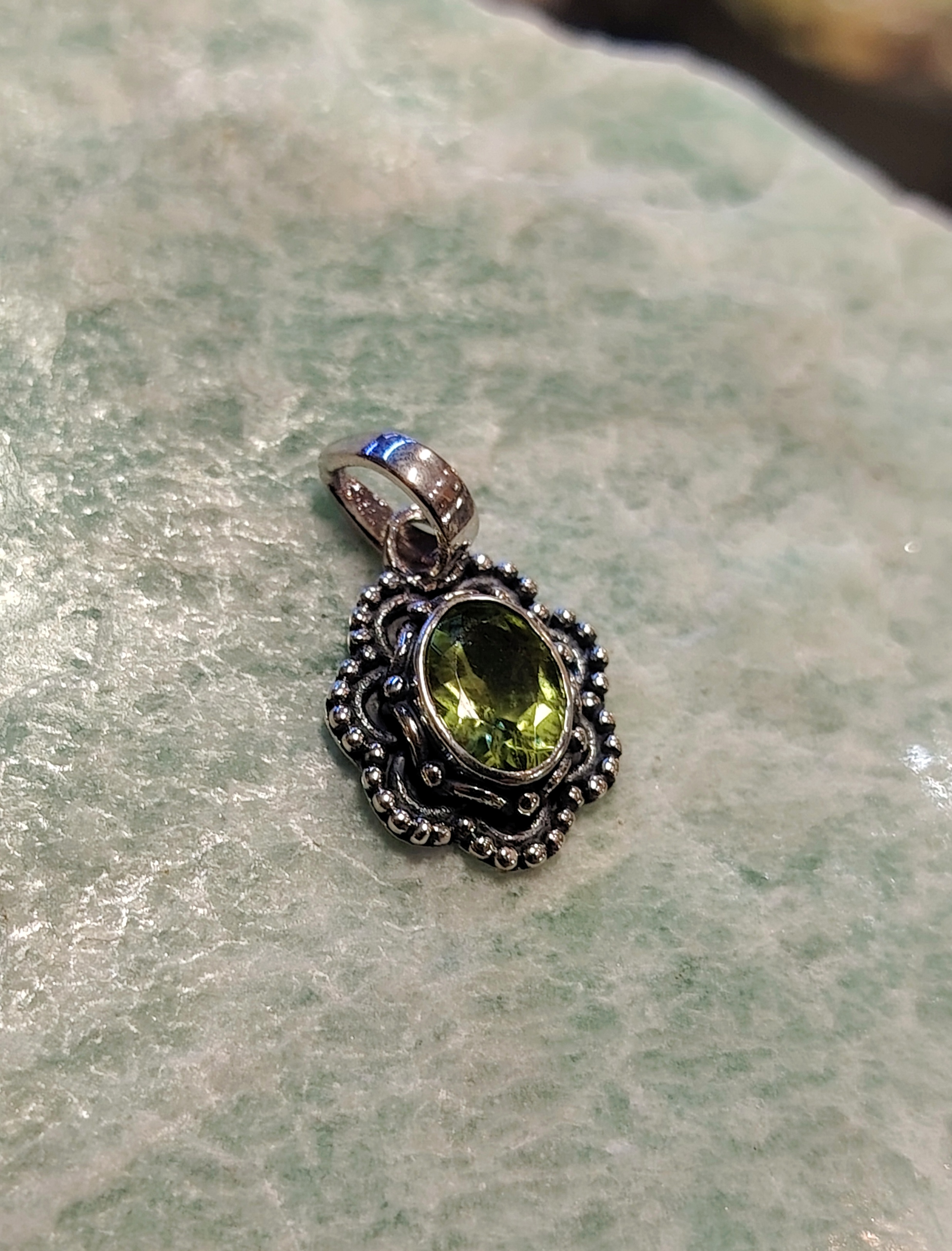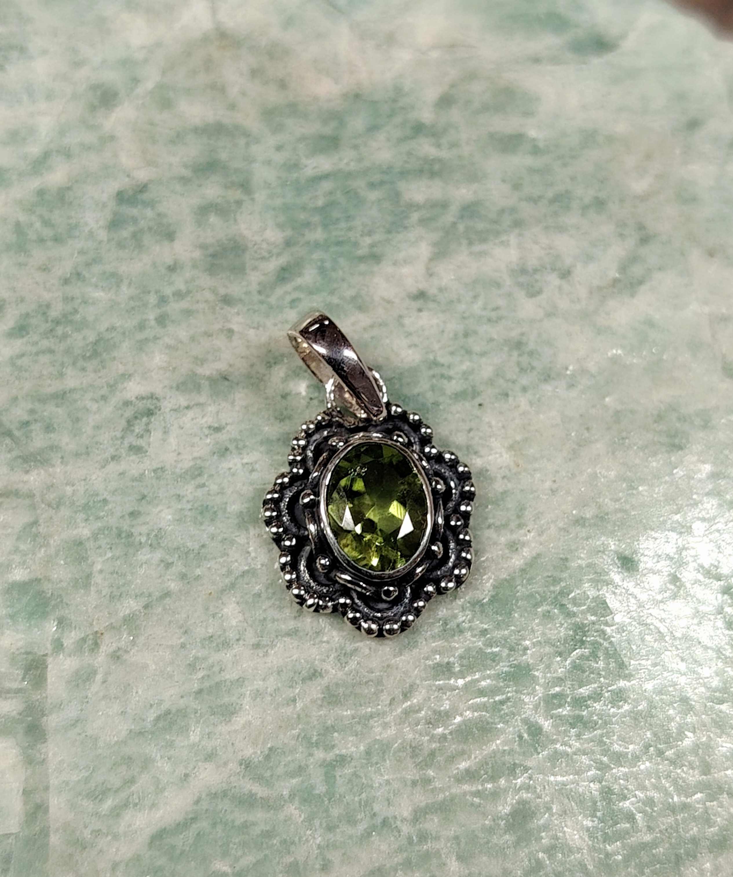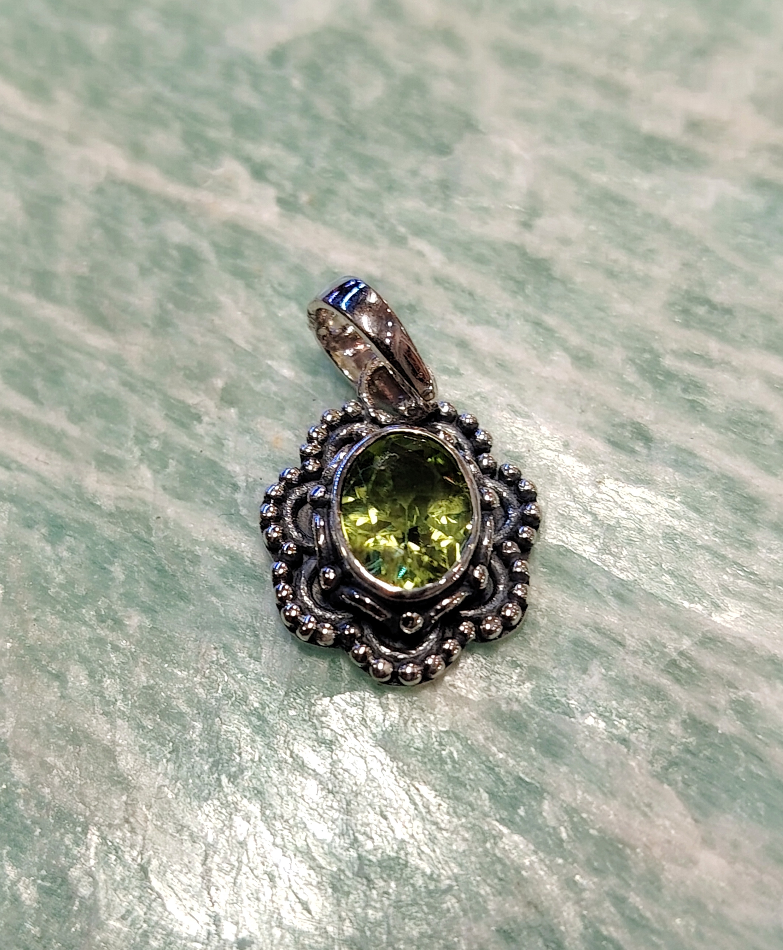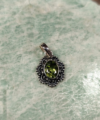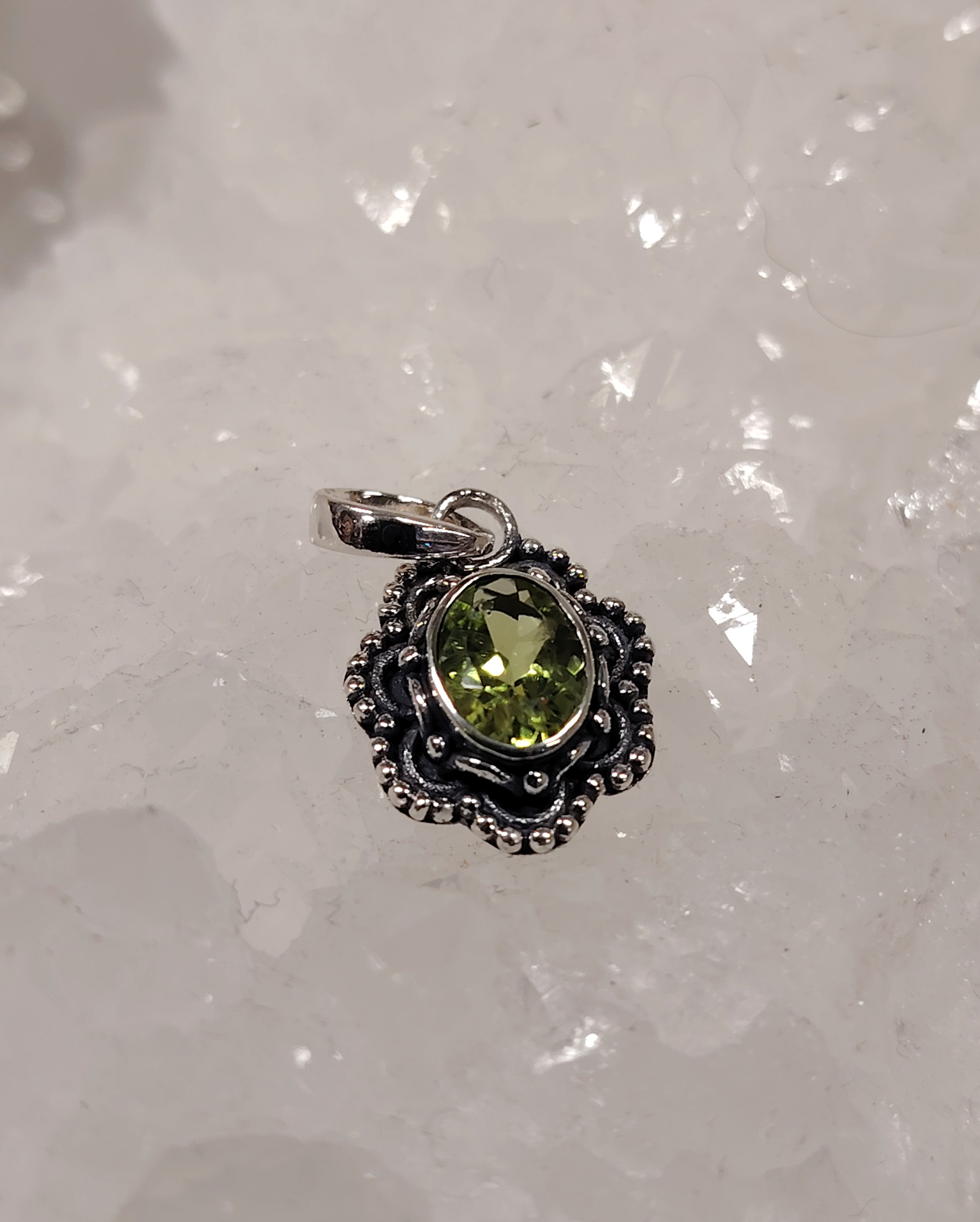 Upea kiviriipus, jossa viistehiottu peridootti hopeisessa kehyksessä